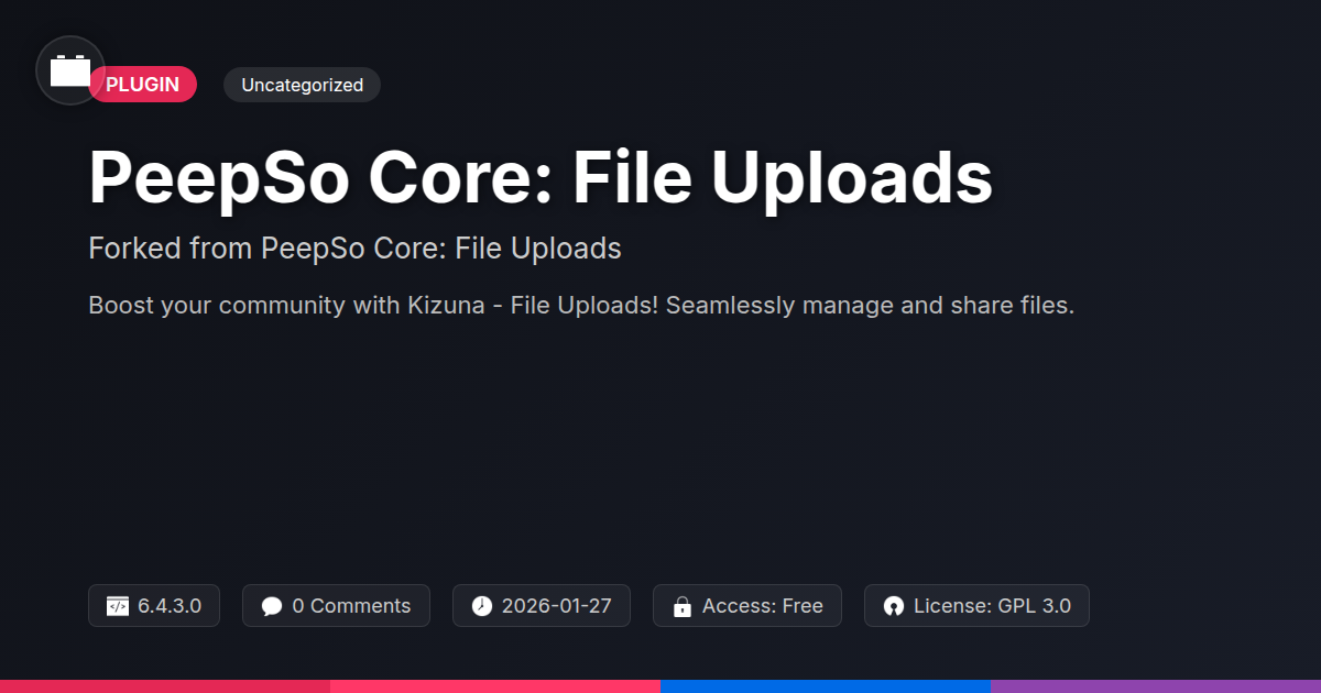 GrootMade is NOT affiliated with PeepSo Core: File Uploads or its original author. PeepSo Core: File Uploads™ is a trademark of its respective owner and use of it does not imply any endorsement or affiliation. This product has been forked under the GNU General Public License (GPL) and all non-GPL assets (such as proprietary images, fonts, and branding) have been removed. Distributing GPL-licensed code is 100% legal.