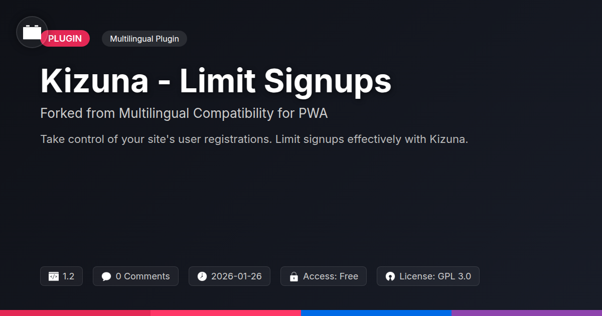 Are you tired of your registration forms turning into a digital free-for-all, attracting bots, spammers, or just way more users than you can handle? Ever wished you could just slam the door shut (politely, of course) when things get a little too popular? If you’re nodding along so hard you might sprain your neck, then it’s time we talked about Kizuna - Limit Signups. This isn't just another plugin; it’s a finely tuned instrument that emerged from the already impressive toolkit of a well-respected multilingual PWA solution. We’ve taken that robust foundation and honed it to give you unparalleled control over who joins your digital domain. Think of it as taking a Swiss Army knife and turning it into a precision scalpel, but for your user registrations. Whether you’re a solo developer trying to fend off bot armies, an agency managing client sites that need strict user controls, or a passionate open-source advocate who appreciates elegant solutions, Kizuna - Limit Signups is here to bring order to the chaos. We're talking about putting you back in the driver's seat, deciding when, how many, and even who gets to hit that sign-up button. No more overwhelming sign-up surges, no more questionable registrations – just smooth, controlled growth for your community or platform. And the best part? It’s built with the same spirit of collaboration and excellence that powers the open-source world.