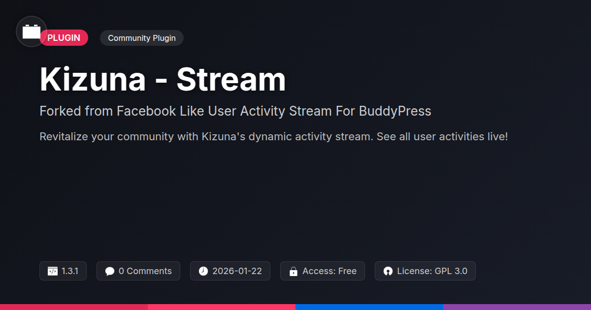 Tired of communities that feel like ghost towns? Meet Kizuna-Stream. Born from a lineage of greatness in specialized plugins, this is Festinger Vault's fresh take. It's a powerful activity stream. It brilliantly highlights user 'likes'. It shows off other key interactions too. Think of it as the digital espresso your users crave. We've scavenged the best bits from wildly popular social hubs. This creates a refreshingly familiar feel. Users will click and engage instinctively. For developers and agencies, this is a dream. It’s a robust, customizable engine. It saves precious hours. Plus, it delivers undeniable engagement metrics. No more dusty digital corners. No more 'crickets' as replies. This plugin is your secret weapon. It's a fork, yes, but one that stands tall. It brings refinement and new life. Your users will finally do things.