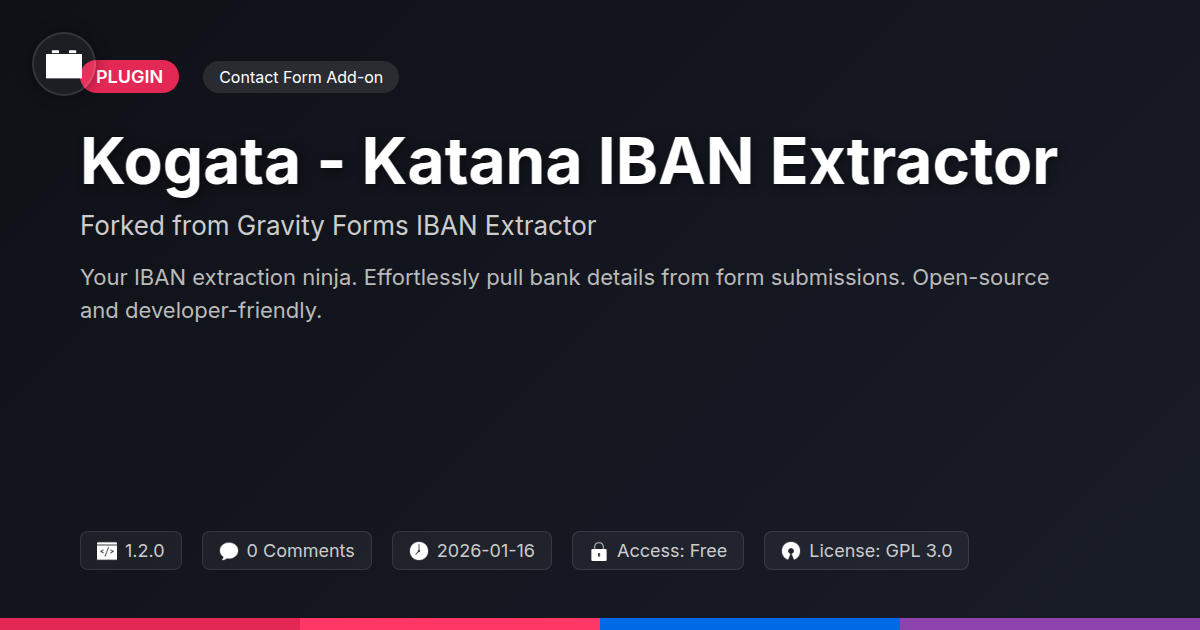 So, there you have it. Kogata - Katana IBAN Extractor. It’s not just another plugin; it’s a focused, efficient tool born from the open-source ethos. For developers and agencies who crave precision, predictability, and a bit of control over their data processing, this is your ninja in the digital shadows. We've stripped away the unnecessary, honed the essential, and delivered a solution that respectfully builds upon a solid foundation. Remember those tedious hours spent copy-pasting bank details? Or the nagging fear of transcription errors? Those days are thankfully behind us. With the Katana, you gain not just an extractor, but a partner in streamlining your workflows. It’s about reclaiming your valuable time and focusing on what truly matters – building awesome digital experiences. This isn’t a magic wand (though it might feel like one), but a testament to how smart, targeted development can solve real-world problems. The beauty of its open-source nature means it’s yours to trust, to understand, and even to contribute to. It’s a nod to the collaborative spirit that drives innovation forward. So, if you're ready to equip your toolkit with a precisely crafted instrument for IBAN extraction, one that respects your development practice and delivers reliable results, look no further. Grab the Kogata - Katana IBAN Extractor and experience the joy of effortless data handling. Your future self, free from manual data drudgery, will thank you.