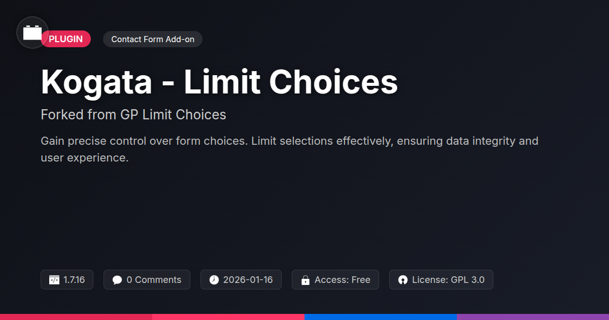 Tired of forms that have more options than a buffet with a two-for-one special? Ever wished you could politely tell your select fields, "Nope, not today" to certain choices based on prior selections? If your form-building life has been a chaotic cascade of users picking the forbidden fruit, then listen up. We've all been there, wrestling with complex conditional logic that feels like trying to herd cats through a laser maze just to restrict a single dropdown option. It’s enough to make even the most seasoned developer consider a career in competitive napping. But what if there was a simpler, more elegant solution? A way to bring order to the chaos, to curate the choices, and make your forms as refined as a vintage scotch? Introducing Kogata - Limit Choices, the open-source descendant of a well-regarded tool, designed to give you granular control over your form's selections without requiring a degree in theoretical physics. Whether you're building a simple contact form or a beastly application form for the next Mars colony, this humble yet powerful addition to your form toolkit is about to become your new best friend. Let's dive into how it can save your sanity and your form’s integrity.