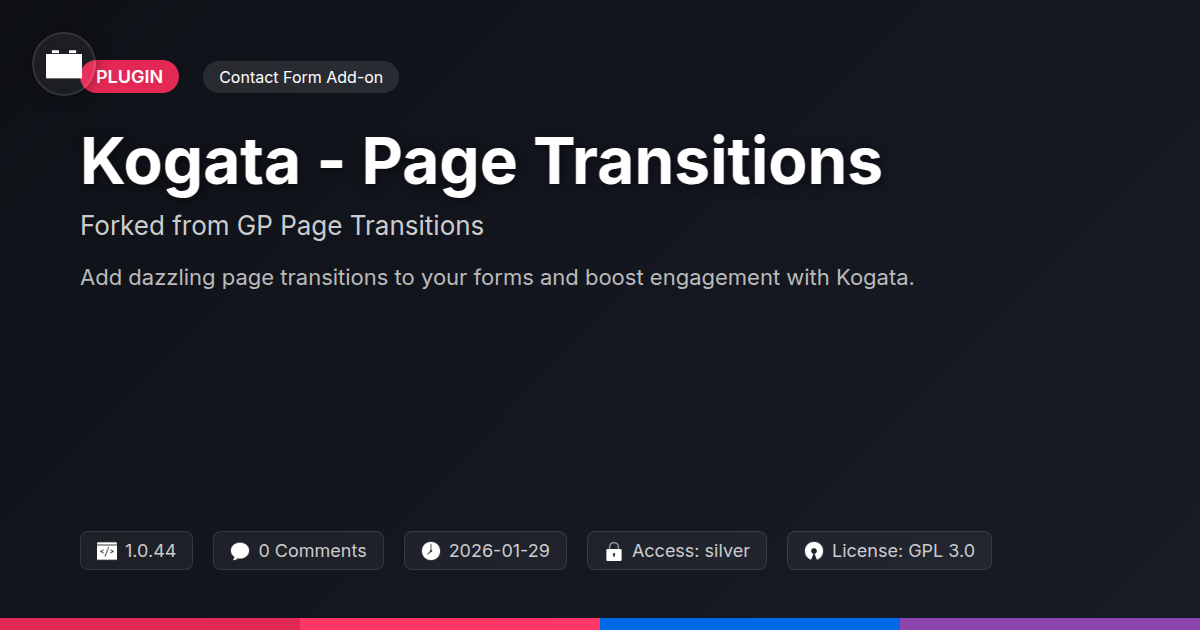 So, there you have it. You've journeyed through the wild west of web page transitions, navigated the choppy waters of clunky forms, and emerged with the most elegant solution this side of a well-executed magic trick. Kogata - Page Transitions isn't just another plugin; it’s your ticket to making your websites feel less like a digital obstacle course and more like a beautifully orchestrated experience. For all you sharp developers and savvy agencies out there, this is your chance to stop inflicting jarring page changes on unsuspecting users and start treating them to a visual feast. Remember that frustration you feel when a website feels like it’s fighting you? Now you can be the hero who prevents that. It’s about finesse, it’s about user retention, and let's be honest, it’s about making your work look darn good. The open-source nature means you're part of a growing family, empowered to tinker, improve, and enjoy the freedom that comes with truly flexible tools. Don't just build websites; build experiences. Smooth ones. So go ahead, install Kogata - Page Transitions, and let your users glide from one page to the next. They’ll thank you for it. And if they don't, well, at least you'll know you've elevated their digital journey.