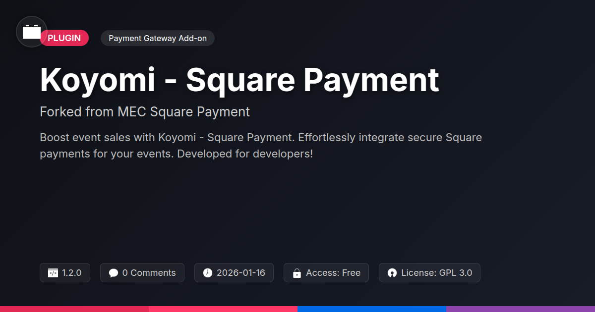Ever felt like your event ticket sales were stuck in the digital Stone Age, fumbling with outdated payment methods that make your attendees want to RSVP with a carrier pigeon? If you're nodding along, muttering about APIs and integrations like a seasoned pro, then you've probably dreamt of a payment solution smoother than a well-optimized SQL query. Well, buckle up, buttercups, because we've taken a beloved tool for handling event finances and given it a fresh coat of paint and a kick in the circuits. Think of it as a phoenix, but instead of rising from ashes, it's risen from… well, let's just say it's a refined, community-driven iteration of a popular solution. We’re talking about Koyomi - Square Payment, a fork of a well-respected integration, now ready to make your event revenue stream flow as freely as your code compiles on the first try. No more wrestling with clunky gateways or explaining to your clients why their fancy gala tickets are being paid for with IOUs. This bad boy is built for developers, agencies, and anyone who appreciates the beauty of open-source solutions that just, well, work. It’s for those who understand that sometimes, the best innovation comes from taking something good and making it even better, with a dash of sass and a whole lot of functionality. Get ready to ditch the payment headaches and focus on what truly matters: creating unforgettable events. You've been asking for it, and we've delivered. Let's talk about making money, the easy way.