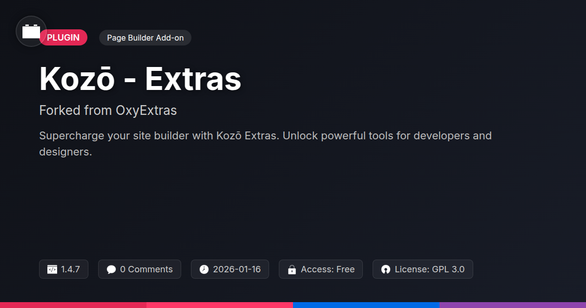 So, there you have it. Kozō - Extras isn't just another set of bells and whistles for your site-building arsenal; it's a carefully curated collection of tools designed to make your life, dare we say, easier. Remember that gnawing feeling of wanting just one more option? That pesky limitation that made you question your design choices? Kozō aims to banish those demons to the digital abyss. Whether you're a developer wrestling with intricate client demands, an agency striving for faster turnaround times without sacrificing quality, or an open-source aficionado who appreciates a project built on collaboration and transparency, this toolkit has something to offer. It’s about reclaiming your creative autonomy and building websites that not only function flawlessly but also look darn good doing it. No more settling for 'good enough' when 'spectacular' is within reach. Think of it as an upgrade for your brain, a shot of espresso for your workflow. It’s time to move beyond the limitations and start building with the confidence and flair you, and your clients, deserve. Now go forth and create something awesome (and maybe send us a postcard).
