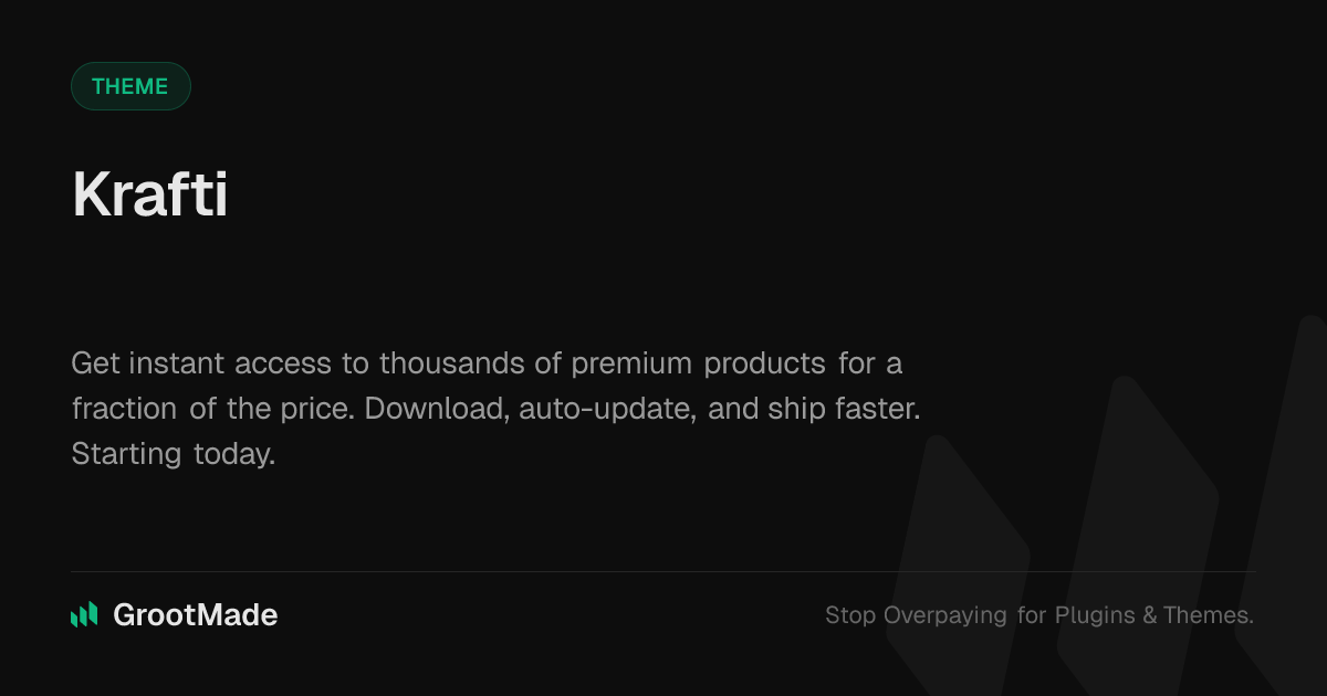 GrootMade is NOT affiliated with Krafti or its original author. Krafti™ is a trademark of its respective owner and use of it does not imply any endorsement or affiliation. This product has been forked under the GNU General Public License (GPL) and all non-GPL assets (such as proprietary images, fonts, and branding) have been removed. Distributing GPL-licensed code is 100% legal.