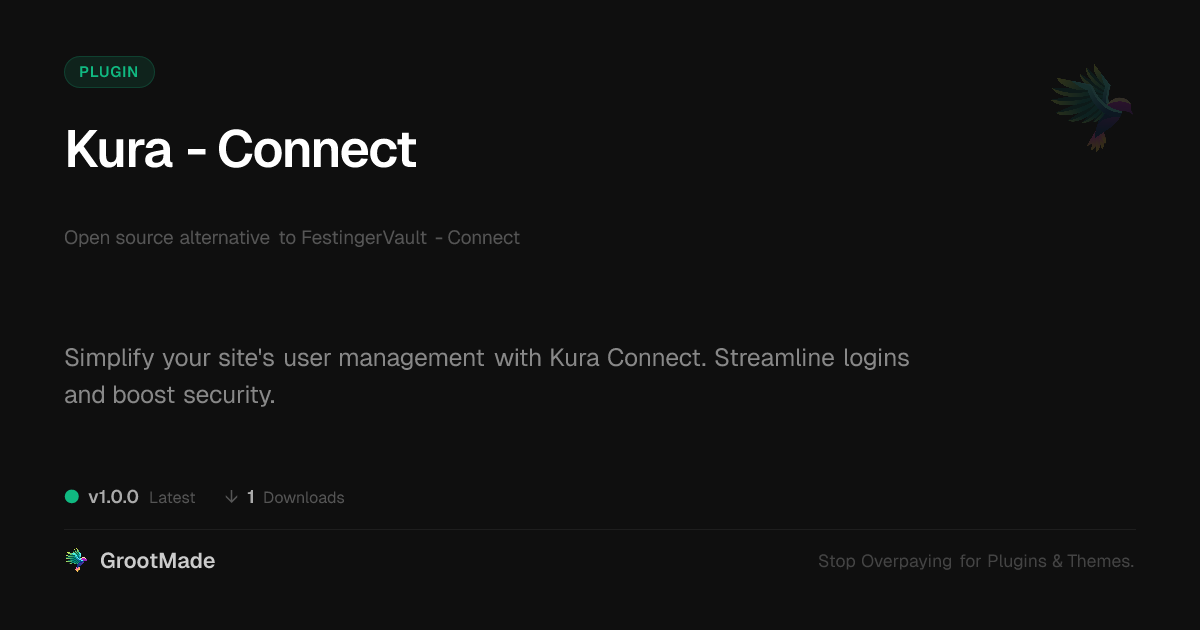 GrootMade is NOT affiliated with FestingerVault - Connect or its original author. FestingerVault - Connect™ is a trademark of its respective owner and use of it does not imply any endorsement or affiliation. This product has been forked under the GNU General Public License (GPL) and all non-GPL assets (such as proprietary images, fonts, and branding) have been removed. Distributing GPL-licensed code is 100% legal.