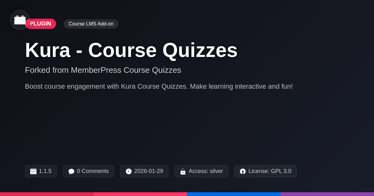 So, there you have it – Kura - Course Quizzes. It's not just another plugin; it's the digital equivalent of handing your students a much-needed energy drink and a personalized roadmap for their learning journey. We've all witnessed the glazed-over eyes, the silent scrolling, the general sense that your brilliant course content is being absorbed about as effectively as a sponge dropped in the ocean. But what if you could flip that script? What if you could spark genuine curiosity, encourage critical thinking, and actually make learning feel like an adventure, not a chore? That's precisely the magic Kura - Course Quizzes brings to the table. For the developers and agencies out there, think of it as your secret weapon: a robust, flexible, and incredibly valuable tool that not only solves a common client problem but also allows for customisation and integration that would make your codebase sing. And for our open-source aficionados, you get the freedom to tinker, to extend, and to make it truly your own, all while standing on the shoulders of giants. No more simply delivering content; it's about facilitating mastery. It's about boosting those completion rates and getting those 'thank you' emails from students who actually learned something. Ready to stop being just another online course provider and start being an experience architect? Kura - Course Quizzes is your next essential development. Go ahead, give your learners something to actually engage with. They (and your clients) will thank you for it.