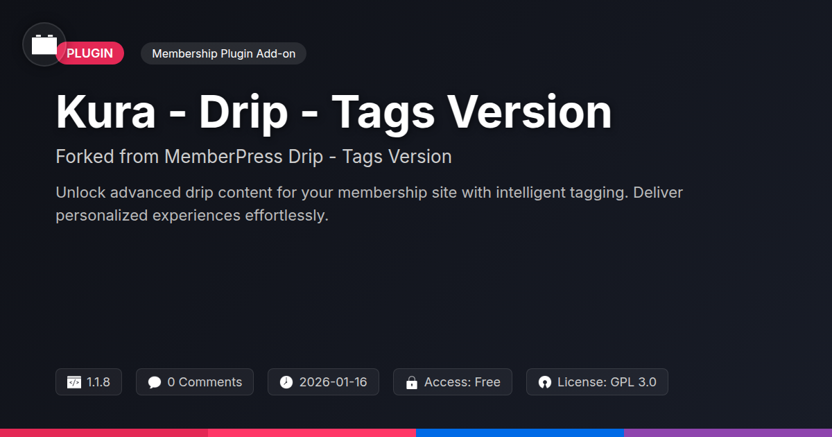 Are your members getting bored waiting for the next piece of gated content? Do you find yourself repeating the same welcome emails, hoping something sticks? If your current content delivery feels like a dripping faucet with more 'drip' than 'content,' then maybe it's time to upgrade. We've all been there: crafting amazing exclusive content, only to have it land with a thud. The trick isn't just having premium content, it's delivering it strategically, drip by tasty drip, to keep your audience engaged and hungry for more. Think about it – who doesn't love a good surprise, especially when it's expertly timed? This isn't about playing hard to get; it's about providing a curated experience, a guided journey through your knowledge base. For developers and agencies who value efficiency and for open-source aficionados who appreciate elegant solutions, the problem is clear: how to automate and refine this process without it feeling like a chore. What if there was a way to automate your content releases, tag members based on their engagement, and ensure everyone gets exactly what they need, when they need it? Enter Kura - Drip - Tags Version, forked from a well-regarded solution and honed to perfection, designed to turn your content from a static library into a dynamic, engaging experience that builds loyalty and encourages continued interaction. It's time to ditch the haphazard content drops and embrace a smarter, more effective approach. Let's dive into how this can revolutionize your membership site.