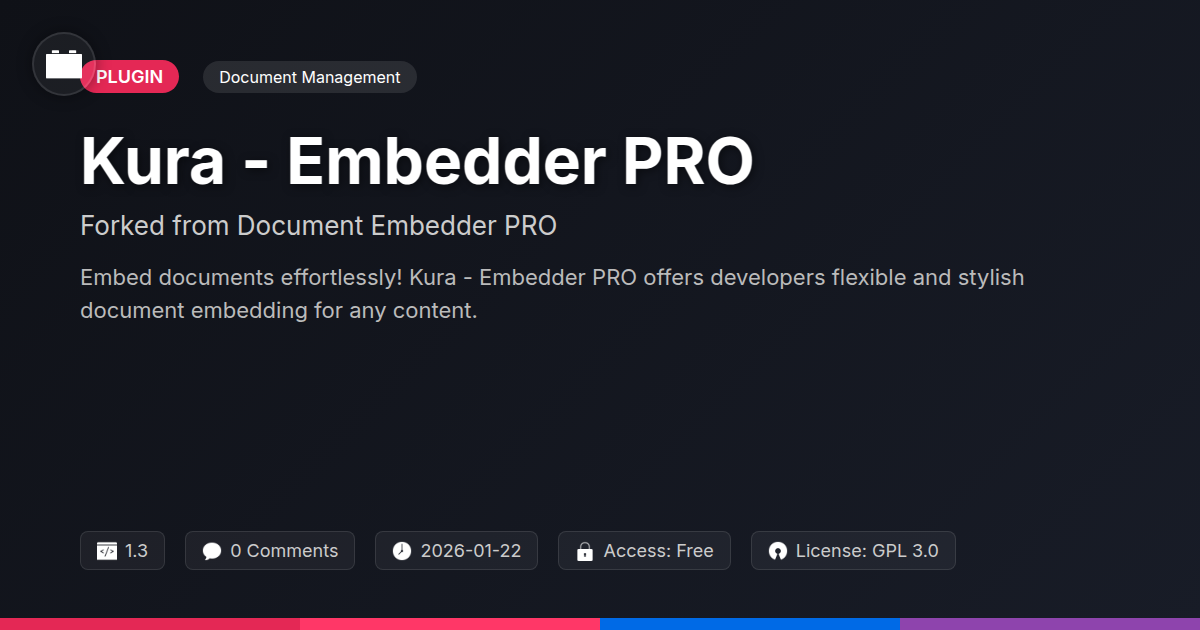 Sick of those clunky, outdated ways of sharing documents online? You know, the ones that make your users want to tear their hair out trying to download a simple PDF (which then opens in a new tab that never closes)? If your development arsenal is crying out for a solution that's as elegant as it is functional, you've stumbled upon the right digital alley. We're talking about Kura - Embedder PRO, a gem of a tool that takes the frustration out of document integration on your website. Forked from a battle-tested original, this solution understands that sometimes, you just need to slap a document right into a page without a whole song and dance. Whether you're an agency crafting polished client sites, a developer building the next big thing, or just an open-source enthusiast who appreciates well-made tools, this plugin is designed to make your life significantly easier. No more fiddling with obscure code snippets or wrestling with ill-fitting iframes. We're here to talk about streamlining your workflow and making your content shine, with the kind of flexibility that makes developers nod approvingly. Get ready to ditch the download dance and embrace the embed era with confidence and a healthy dose of sarcasm.
