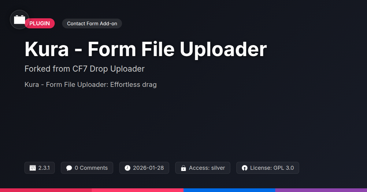 So there you have it. You've journeyed through the often-uninspiring landscape of file uploads and emerged into the bright, shiny world of Kura - Form File Uploader. We’ve dissected why those clunky, old-school input fields are about as fashionable as dial-up internet, and how Kura offers a refreshingly modern, user-friendly alternative. For the developers and agency wizards among us, you’ve seen how this tool isn’t just a quick fix, but a genuine enhancement that streamlines workflows, impresses clients, and makes your digital creations shine. The no-fuss integration, the sensible features that offer real control, and the sheer elegance of a drag-and-drop interface – it all adds up to a solution that just works. And for our esteemed open-source enthusiasts, Kura represents the best of what community-driven development offers: power, flexibility, and a commitment to innovation. It’s a testament to the fact that you don’t need to break the bank or wrestle with complex code to achieve professional-grade functionality. Kura - Form File Uploader is more than just a plugin; it’s an upgrade to your entire user experience, a subtle yet significant improvement that users will appreciate, and you'll love implementing. It’s about making the small things, like attaching a document, feel effortless and even a little bit delightful. So, go ahead, give your forms the upgrade they deserve. Embrace the droppable future and leave those prehistoric upload methods in the digital dust.