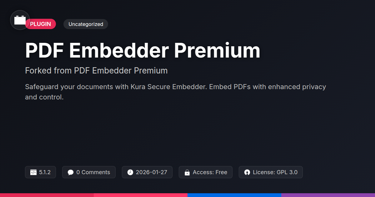 GrootMade is NOT affiliated with PDF Embedder Premium or its original author. PDF Embedder Premium™ is a trademark of its respective owner and use of it does not imply any endorsement or affiliation. This product has been forked under the GNU General Public License (GPL) and all non-GPL assets (such as proprietary images, fonts, and branding) have been removed. Distributing GPL-licensed code is 100% legal.