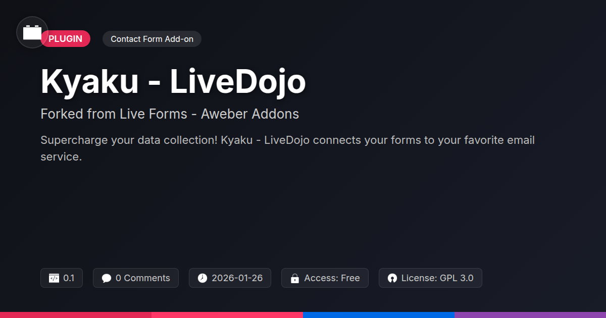 GrootMade is NOT affiliated with Live Forms - Aweber Addons or its original author. Live Forms - Aweber Addons™ is a trademark of its respective owner and use of it does not imply any endorsement or affiliation. This product has been forked under the GNU General Public License (GPL) and all non-GPL assets (such as proprietary images, fonts, and branding) have been removed. Distributing GPL-licensed code is 100% legal.