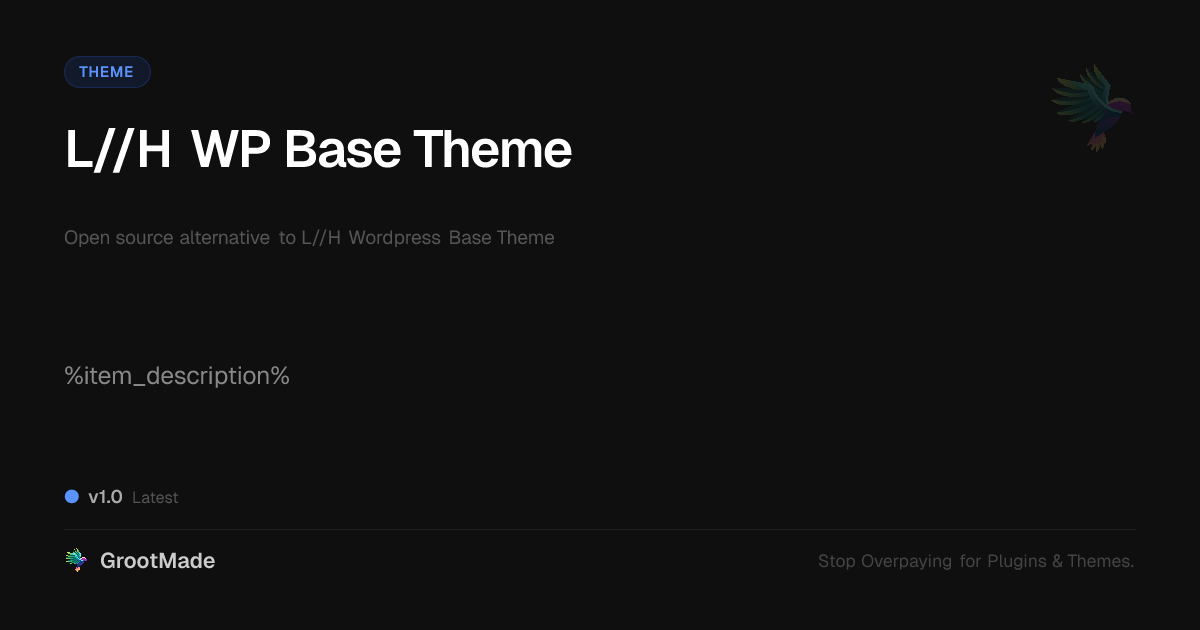 GrootMade is NOT affiliated with L//H Wordpress Base Theme or its original author. L//H Wordpress Base Theme™ is a trademark of its respective owner and use of it does not imply any endorsement or affiliation. This product has been forked under the GNU General Public License (GPL) and all non-GPL assets (such as proprietary images, fonts, and branding) have been removed. Distributing GPL-licensed code is 100% legal.