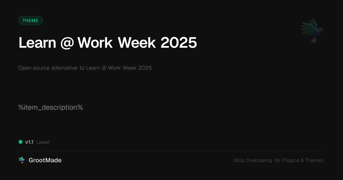 GrootMade is NOT affiliated with Learn @ Work Week 2025 or its original author. Learn @ Work Week 2025™ is a trademark of its respective owner and use of it does not imply any endorsement or affiliation. This product has been forked under the GNU General Public License (GPL) and all non-GPL assets (such as proprietary images, fonts, and branding) have been removed. Distributing GPL-licensed code is 100% legal.