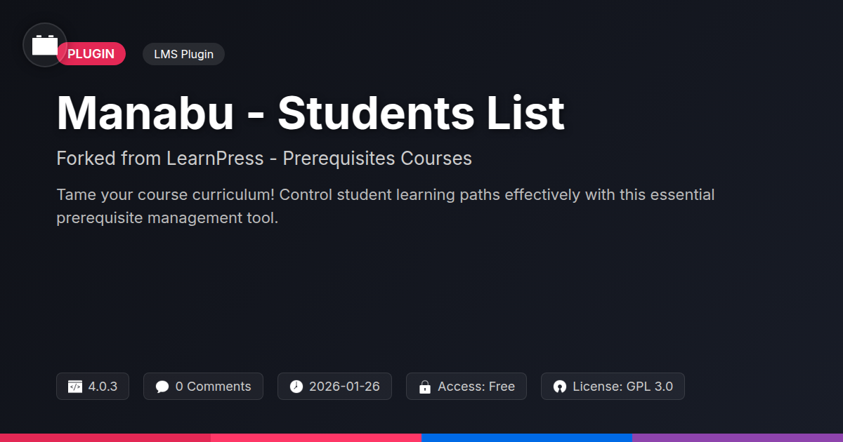 So, there you have it. We've journeyed through the digital wilderness of online education and emerged with a beacon of order: Manabu - Students List. It’s more than just a plugin; it’s your new best friend in the never-ending quest to make your learning platform not just functional, but actually effective. For too long, we’ve seen ambitious educational visions crumble under the weight of disorganized student lists and chaotic course progression. It’s the digital equivalent of trying to build a skyscraper on a foundation of sand – destined for a messy collapse. But with the structured pathways and clear student oversight this tool provides, you’re laying down concrete. You’re building something solid, something that respects the learning journey, and frankly, something that saves you a boatload of headaches. Think of the reduced support tickets. Think of the happier students who actually understand what they’re learning because they’ve got the prerequisites to prove it. Think of the streamlined administration that frees you up to focus on what truly matters: creating amazing content and fostering a thriving learning community. For the developers and agencies out there, this isn't just another piece of code; it's a shortcut to client satisfaction and a testament to smart, efficient development. And for our open-source aficionados, you know the value of community-driven innovation. This fork represents that spirit, refined and ready to serve. So, whether you’re tired of playing digital kindergarten teacher or you’re a developer looking for that perfect, reliable solution, Manabu - Students List is your answer. It’s time to stop wishing for order and start implementing it. Your platform, your students, and your sanity will thank you.