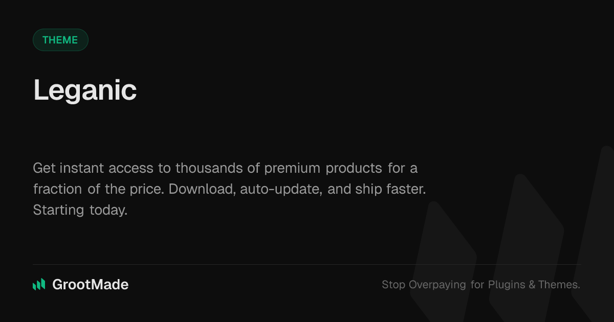 GrootMade is NOT affiliated with Leganic or its original author. Leganic™ is a trademark of its respective owner and use of it does not imply any endorsement or affiliation. This product has been forked under the GNU General Public License (GPL) and all non-GPL assets (such as proprietary images, fonts, and branding) have been removed. Distributing GPL-licensed code is 100% legal.