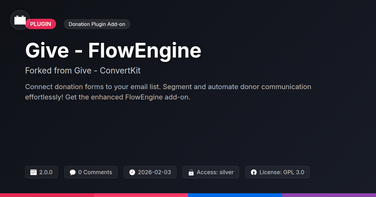 So, there you have it. You've spent countless hours crafting those perfect donation pages, making them look slick and feel intuitive. But let's be honest, the real party starts after the click. If your donor data is currently collecting dust bunnies in a forgotten corner of your database, it's time for an intervention. Give - FlowEngine isn't just another shiny add-on; it's the intelligent connector that finally makes your donation forms work overtime – for you. Think of it as the ultimate wingman for your email marketing, ensuring every valuable donor interaction is seen, acknowledged, and nurtured. For the devs and agencies out there who appreciate elegant solutions and the spirit of open-source collaboration, this fork represents an evolution, a more robust and flexible engine for building genuine relationships. No more manual exporting, importing, and praying things align. This is about smart segmentation, automated thank-yous that actually sound human, and building a loyal community that sticks around. It’s about turning those one-off donations into lasting support. Ditch the data silos and embrace a smarter way to engage. Your donors—and your bottom line—will thank you.
