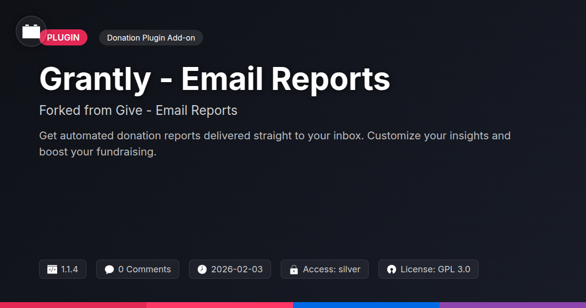 So there you have it. No more wrestling with data in the dark, hoping you haven't missed a crucial donor or a vital trend. Grantly - Email Reports isn't just another plugin; it's your dedicated ally in the quest for successful online fundraising. It’s the digital butler you never knew you needed, diligently compiling your donation data and serving it up precisely when and how you want it. For the developers crafting elegant solutions, the agencies orchestrating complex campaigns for multiple clients, and the passionate open-source advocates who believe in powerful, transparent tools, Grantly offers a refreshing blend of efficiency and insight. It’s about reclaiming your time, empowering your decisions with actionable data, and fostering a deeper understanding of your audience's generosity. Imagine the peace of mind knowing that critical performance metrics are landing in your inbox like clockwork, allowing you to focus on what you do best – whether that’s coding, strategizing, or nurturing your community. This tool embodies the spirit of smart technology: it works tirelessly in the background, so you don’t have to. Embrace the ease, the customization, and the underlying power of a tool built with your needs in mind.