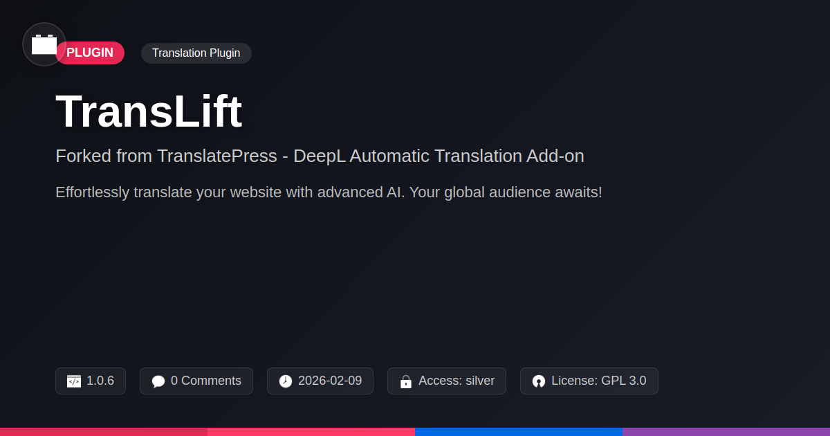 GrootMade is NOT affiliated with TranslatePress - DeepL Automatic Translation Add-on or its original author. TranslatePress - DeepL Automatic Translation Add-on™ is a trademark of its respective owner and use of it does not imply any endorsement or affiliation. This product has been forked under the GNU General Public License (GPL) and all non-GPL assets (such as proprietary images, fonts, and branding) have been removed. Distributing GPL-licensed code is 100% legal.