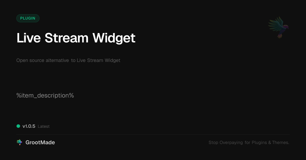 GrootMade is NOT affiliated with Live Stream Widget or its original author. Live Stream Widget™ is a trademark of its respective owner and use of it does not imply any endorsement or affiliation. This product has been forked under the GNU General Public License (GPL) and all non-GPL assets (such as proprietary images, fonts, and branding) have been removed. Distributing GPL-licensed code is 100% legal.