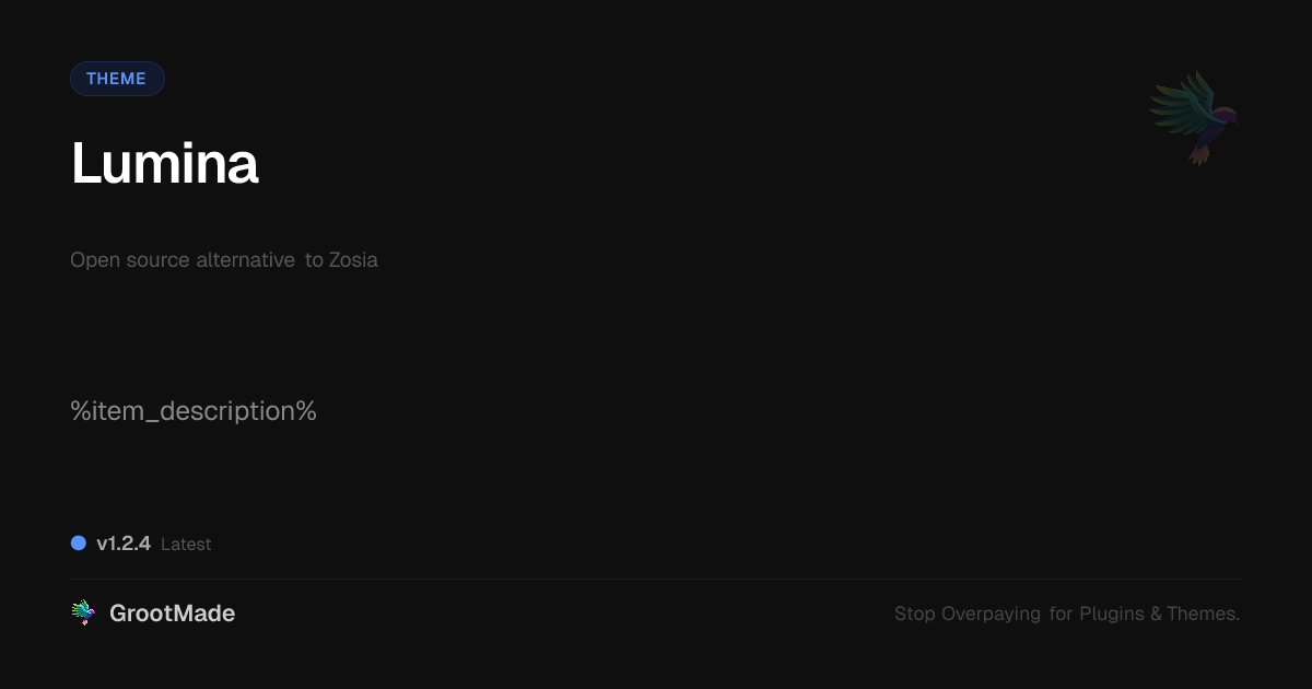 GrootMade is NOT affiliated with Zosia or its original author. Zosia™ is a trademark of its respective owner and use of it does not imply any endorsement or affiliation. This product has been forked under the GNU General Public License (GPL) and all non-GPL assets (such as proprietary images, fonts, and branding) have been removed. Distributing GPL-licensed code is 100% legal.