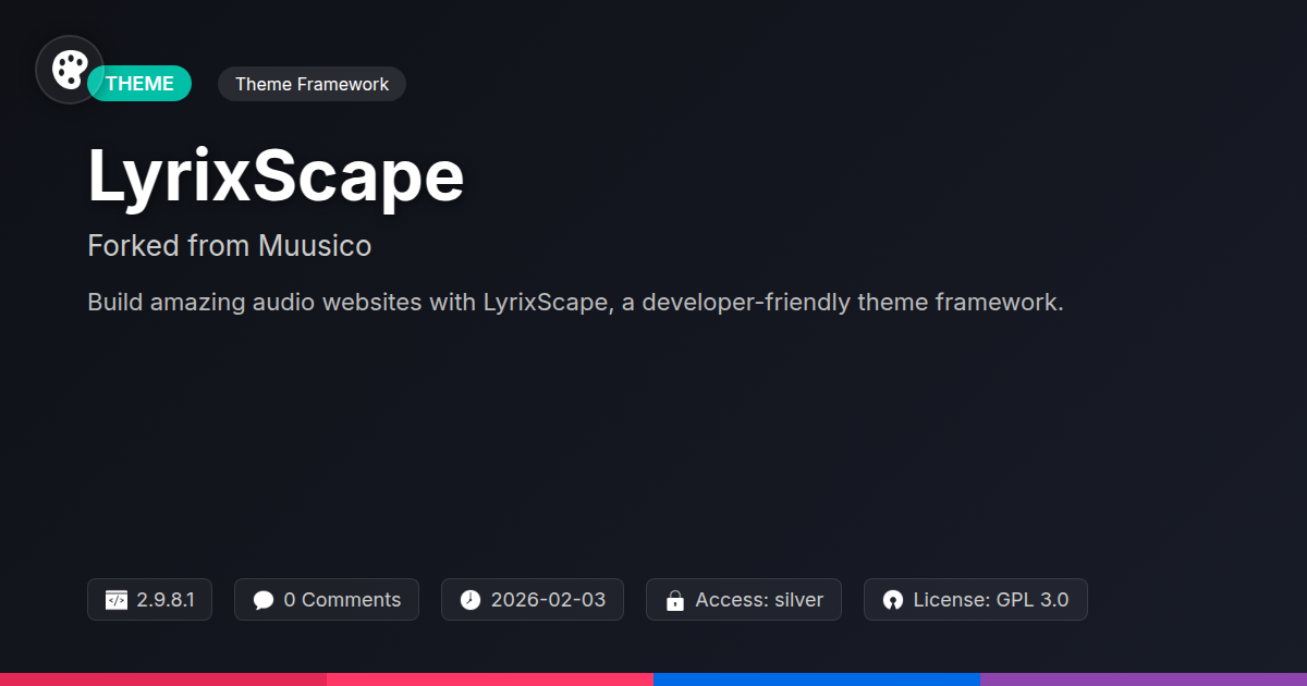 Honestly, are we drowning in audio themes yet? It certainly feels like it. So, why bother launching another one? Because, bless its open-source heart, the digital audio playground needed a serious rethink. Picture this: a theme born from a robust foundation, not from scratch. This isn’t about reinventing the wheel; it’s about putting a souped-up engine in a classic chassis. We took a solid base, built by folks who get it, and gave it a good shake. The goal? To serve the builders: the developers, the design agencies, the staunch open-source fans. You know who you are. You crave control. You despise bloat. You demand flexibility. LyrixScape is that thing. It’s a powerful, adaptable canvas for any audio-centric website. Think less 'pre-made package,' more 'developer's toolkit.' We’re talking about a flexible foundation to build your masterpiece on, without fighting the framework every step of the way. No more wrestling with rigid designs or locked-down functionality. This is your space to create.