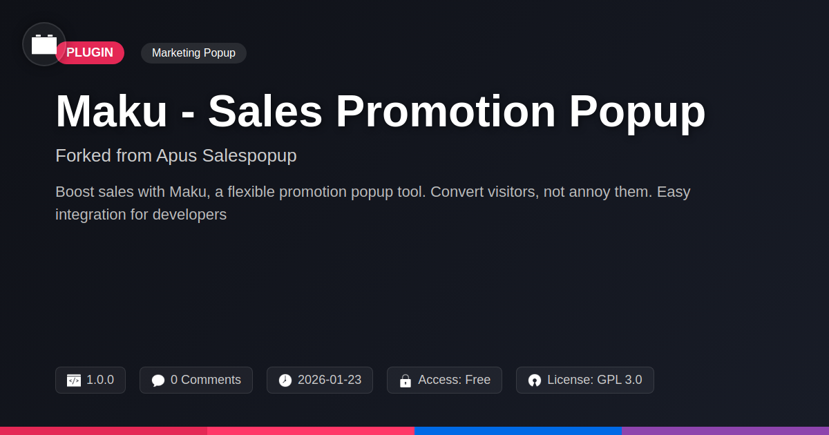 Let's be honest, in the wild west of online sales, getting your promotions noticed can feel like trying to herd cats. You've got killer deals, groundbreaking discounts, or maybe just a really cute GIF you want to share. But how do you make sure your visitors actually see it before they click away to argue with a stranger on the internet? That's where Maku swoops in, fork-in-hand, ready to salvage your sales strategy from the brink of obscurity. We get it. You're a developer, a digital wizard, an agency owner juggling a million projects, or an open-source enthusiast who believes in the power of community. You don't have time for clunky interfaces or plugins that require a PhD in rocket science to configure. You need something efficient, flexible, and frankly, something that doesn't make you question your career choices. This isn't just another popup plugin; it's a refined tool born from a solid foundation, polished with a dash of community spirit, and designed to stop those valuable clicks from slipping through your fingers. Ready to make some noise and boost those conversions? Let's dive into how Maku can be your new best friend in the art of the sale.