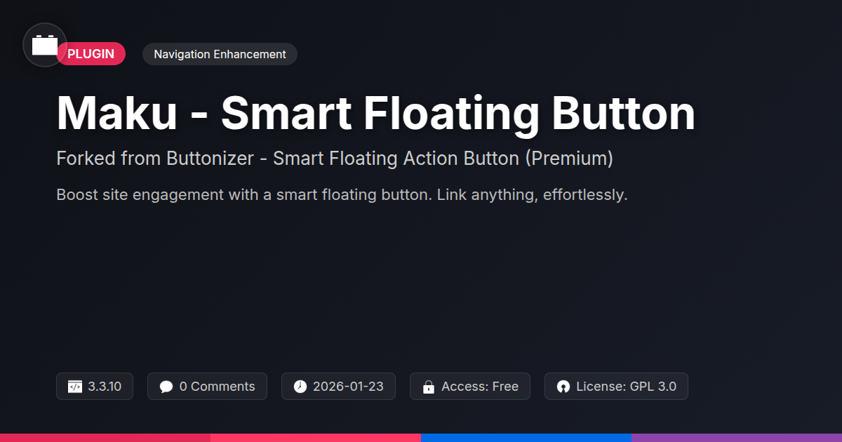 GrootMade is NOT affiliated with Buttonizer - Smart Floating Action Button (Premium) or its original author. Buttonizer - Smart Floating Action Button (Premium)™ is a trademark of its respective owner and use of it does not imply any endorsement or affiliation. This product has been forked under the GNU General Public License (GPL) and all non-GPL assets (such as proprietary images, fonts, and branding) have been removed. Distributing GPL-licensed code is 100% legal.