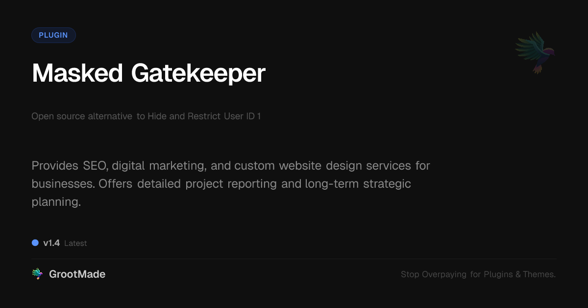 GrootMade is NOT affiliated with Hide and Restrict User ID 1 or its original author. Hide and Restrict User ID 1™ is a trademark of its respective owner and use of it does not imply any endorsement or affiliation. This product has been forked under the GNU General Public License (GPL) and all non-GPL assets (such as proprietary images, fonts, and branding) have been removed. Distributing GPL-licensed code is 100% legal.