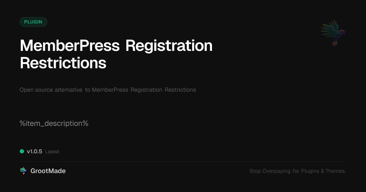 GrootMade is NOT affiliated with MemberPress Registration Restrictions or its original author. MemberPress Registration Restrictions™ is a trademark of its respective owner and use of it does not imply any endorsement or affiliation. This product has been forked under the GNU General Public License (GPL) and all non-GPL assets (such as proprietary images, fonts, and branding) have been removed. Distributing GPL-licensed code is 100% legal.