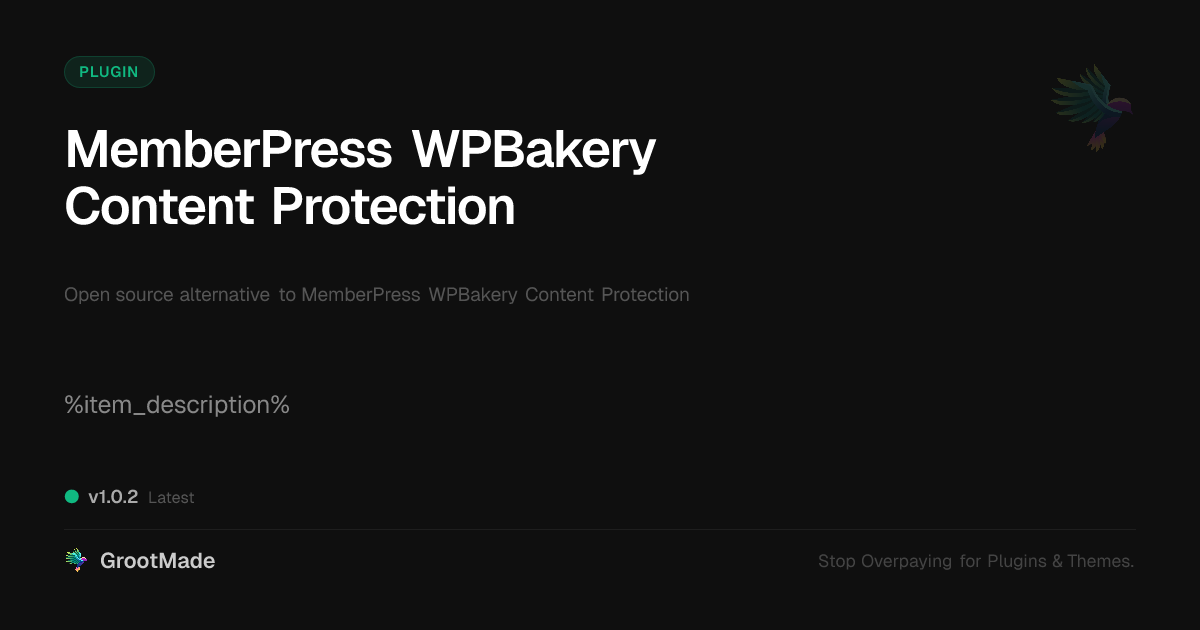 GrootMade is NOT affiliated with MemberPress WPBakery Content Protection or its original author. MemberPress WPBakery Content Protection™ is a trademark of its respective owner and use of it does not imply any endorsement or affiliation. This product has been forked under the GNU General Public License (GPL) and all non-GPL assets (such as proprietary images, fonts, and branding) have been removed. Distributing GPL-licensed code is 100% legal.
