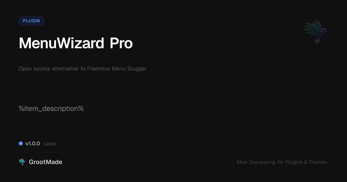 GrootMade is NOT affiliated with Freemius Menu Slugger or its original author. Freemius Menu Slugger™ is a trademark of its respective owner and use of it does not imply any endorsement or affiliation. This product has been forked under the GNU General Public License (GPL) and all non-GPL assets (such as proprietary images, fonts, and branding) have been removed. Distributing GPL-licensed code is 100% legal.