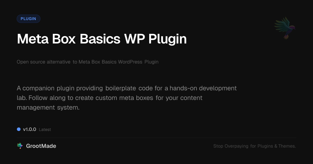 GrootMade is NOT affiliated with Meta Box Basics WordPress Plugin or its original author. Meta Box Basics WordPress Plugin™ is a trademark of its respective owner and use of it does not imply any endorsement or affiliation. This product has been forked under the GNU General Public License (GPL) and all non-GPL assets (such as proprietary images, fonts, and branding) have been removed. Distributing GPL-licensed code is 100% legal.