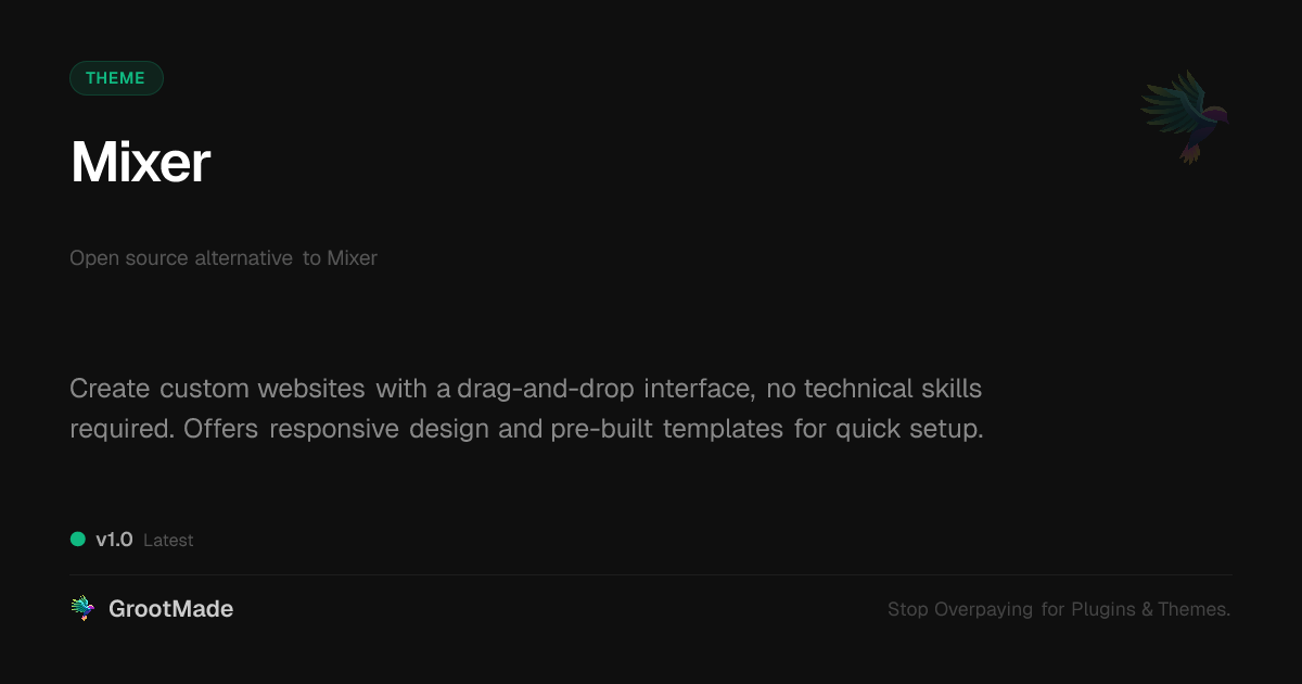 GrootMade is NOT affiliated with Mixer or its original author. Mixer™ is a trademark of its respective owner and use of it does not imply any endorsement or affiliation. This product has been forked under the GNU General Public License (GPL) and all non-GPL assets (such as proprietary images, fonts, and branding) have been removed. Distributing GPL-licensed code is 100% legal.