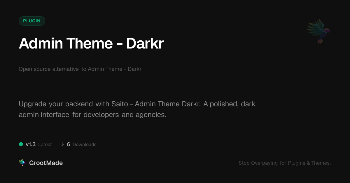 GrootMade is NOT affiliated with Admin Theme - Darkr or its original author. Admin Theme - Darkr™ is a trademark of its respective owner and use of it does not imply any endorsement or affiliation. This product has been forked under the GNU General Public License (GPL) and all non-GPL assets (such as proprietary images, fonts, and branding) have been removed. Distributing GPL-licensed code is 100% legal.