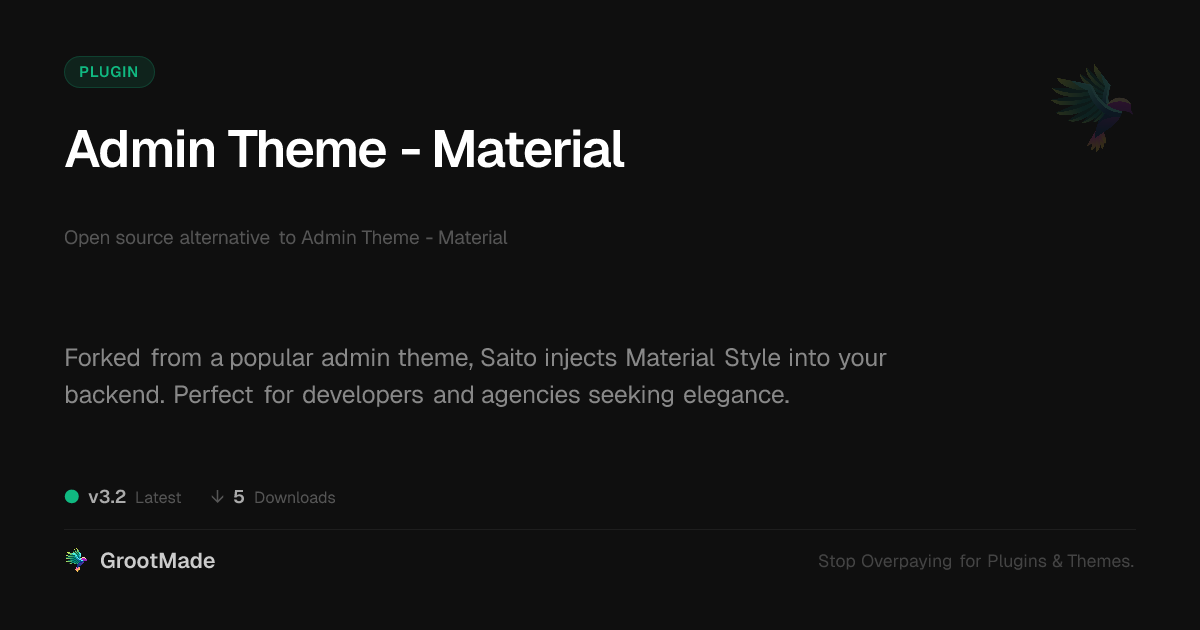 GrootMade is NOT affiliated with Admin Theme - Material or its original author. Admin Theme - Material™ is a trademark of its respective owner and use of it does not imply any endorsement or affiliation. This product has been forked under the GNU General Public License (GPL) and all non-GPL assets (such as proprietary images, fonts, and branding) have been removed. Distributing GPL-licensed code is 100% legal.
