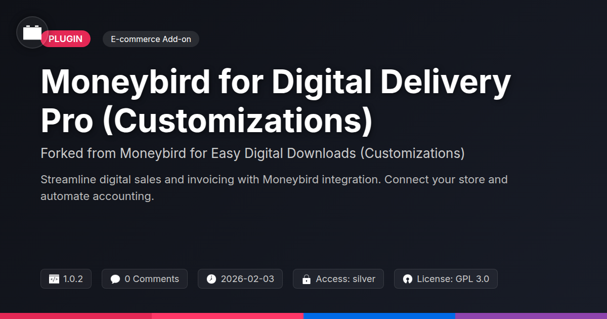 GrootMade is NOT affiliated with Moneybird for Easy Digital Downloads (Customizations) or its original author. Moneybird for Easy Digital Downloads (Customizations)™ is a trademark of its respective owner and use of it does not imply any endorsement or affiliation. This product has been forked under the GNU General Public License (GPL) and all non-GPL assets (such as proprietary images, fonts, and branding) have been removed. Distributing GPL-licensed code is 100% legal.