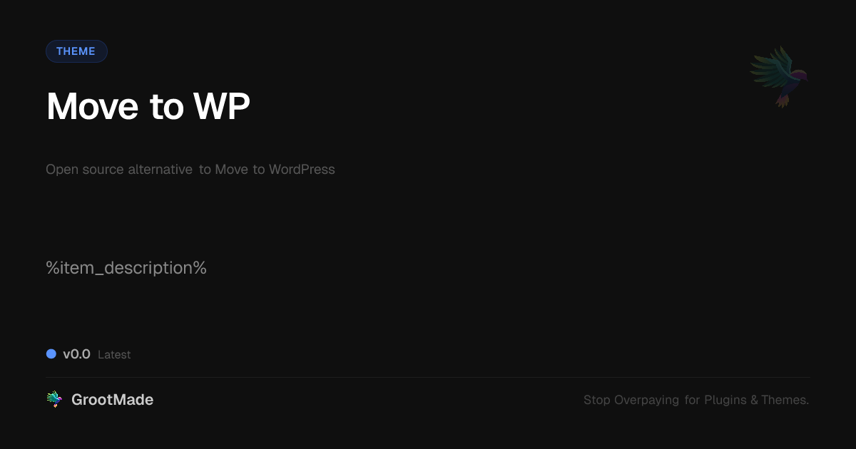 GrootMade is NOT affiliated with Move to WordPress or its original author. Move to WordPress™ is a trademark of its respective owner and use of it does not imply any endorsement or affiliation. This product has been forked under the GNU General Public License (GPL) and all non-GPL assets (such as proprietary images, fonts, and branding) have been removed. Distributing GPL-licensed code is 100% legal.