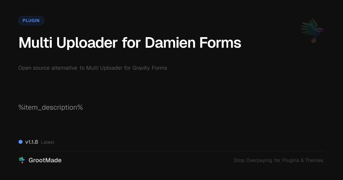 GrootMade is NOT affiliated with Multi Uploader for Gravity Forms or its original author. Multi Uploader for Gravity Forms™ is a trademark of its respective owner and use of it does not imply any endorsement or affiliation. This product has been forked under the GNU General Public License (GPL) and all non-GPL assets (such as proprietary images, fonts, and branding) have been removed. Distributing GPL-licensed code is 100% legal.