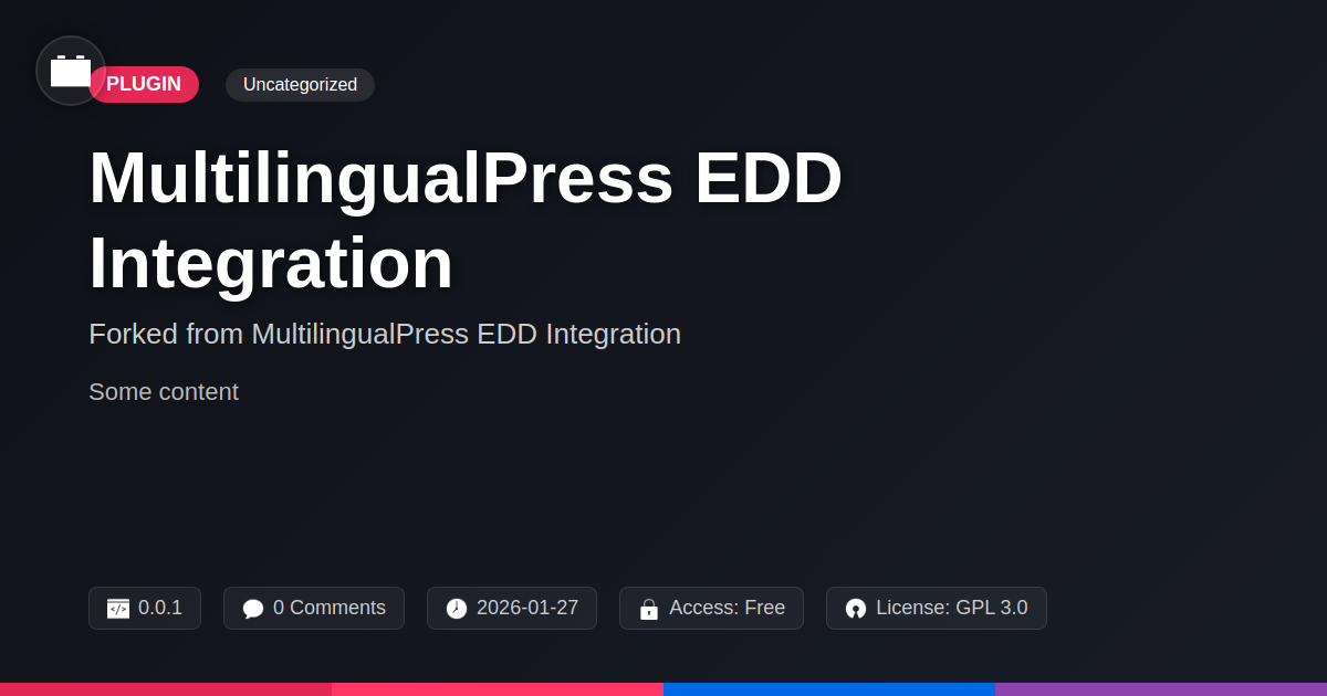 GrootMade is NOT affiliated with MultilingualPress EDD Integration or its original author. MultilingualPress EDD Integration™ is a trademark of its respective owner and use of it does not imply any endorsement or affiliation. This product has been forked under the GNU General Public License (GPL) and all non-GPL assets (such as proprietary images, fonts, and branding) have been removed. Distributing GPL-licensed code is 100% legal.