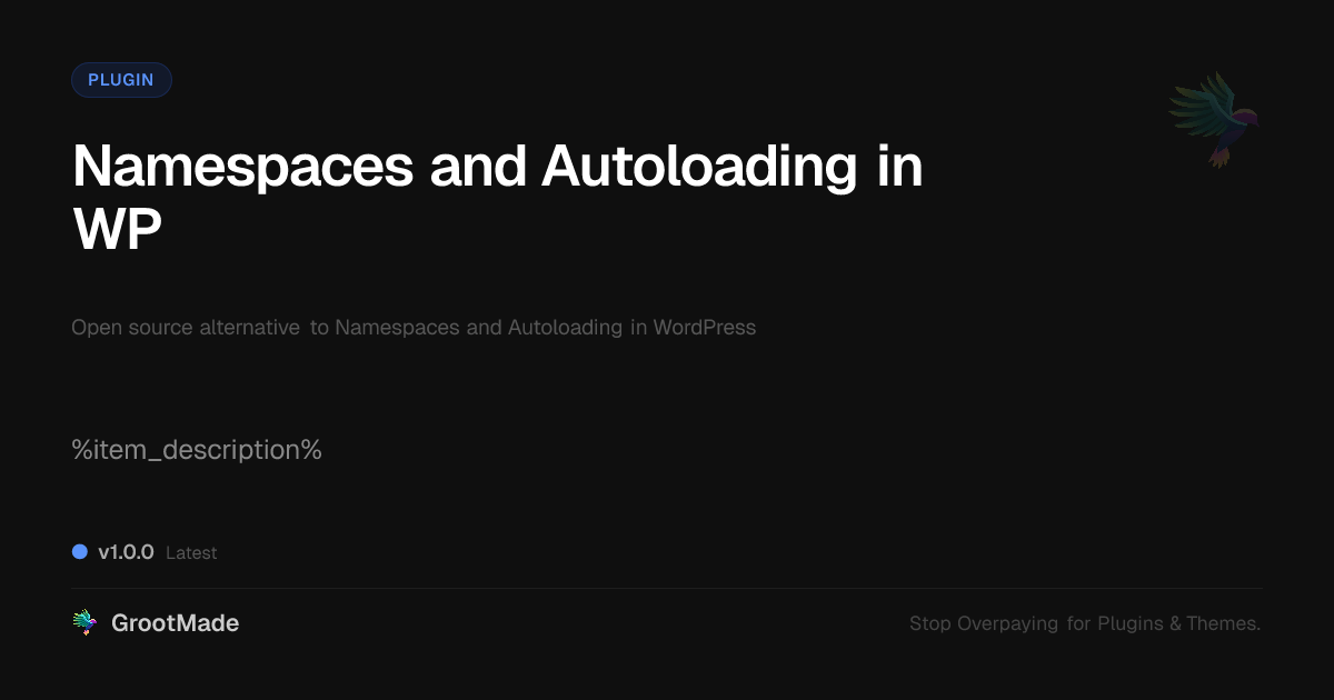 GrootMade is NOT affiliated with Namespaces and Autoloading in WordPress or its original author. Namespaces and Autoloading in WordPress™ is a trademark of its respective owner and use of it does not imply any endorsement or affiliation. This product has been forked under the GNU General Public License (GPL) and all non-GPL assets (such as proprietary images, fonts, and branding) have been removed. Distributing GPL-licensed code is 100% legal.
