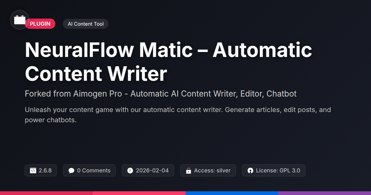 GrootMade is NOT affiliated with Aimogen Pro - Automatic AI Content Writer, Editor, Chatbot & AI Toolkit or its original author. Aimogen Pro - Automatic AI Content Writer, Editor, Chatbot & AI Toolkit™ is a trademark of its respective owner and use of it does not imply any endorsement or affiliation. This product has been forked under the GNU General Public License (GPL) and all non-GPL assets (such as proprietary images, fonts, and branding) have been removed. Distributing GPL-licensed code is 100% legal.