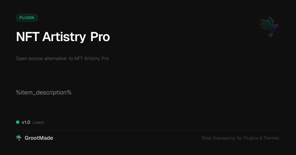 GrootMade is NOT affiliated with NFT Artistry Pro or its original author. NFT Artistry Pro™ is a trademark of its respective owner and use of it does not imply any endorsement or affiliation. This product has been forked under the GNU General Public License (GPL) and all non-GPL assets (such as proprietary images, fonts, and branding) have been removed. Distributing GPL-licensed code is 100% legal.