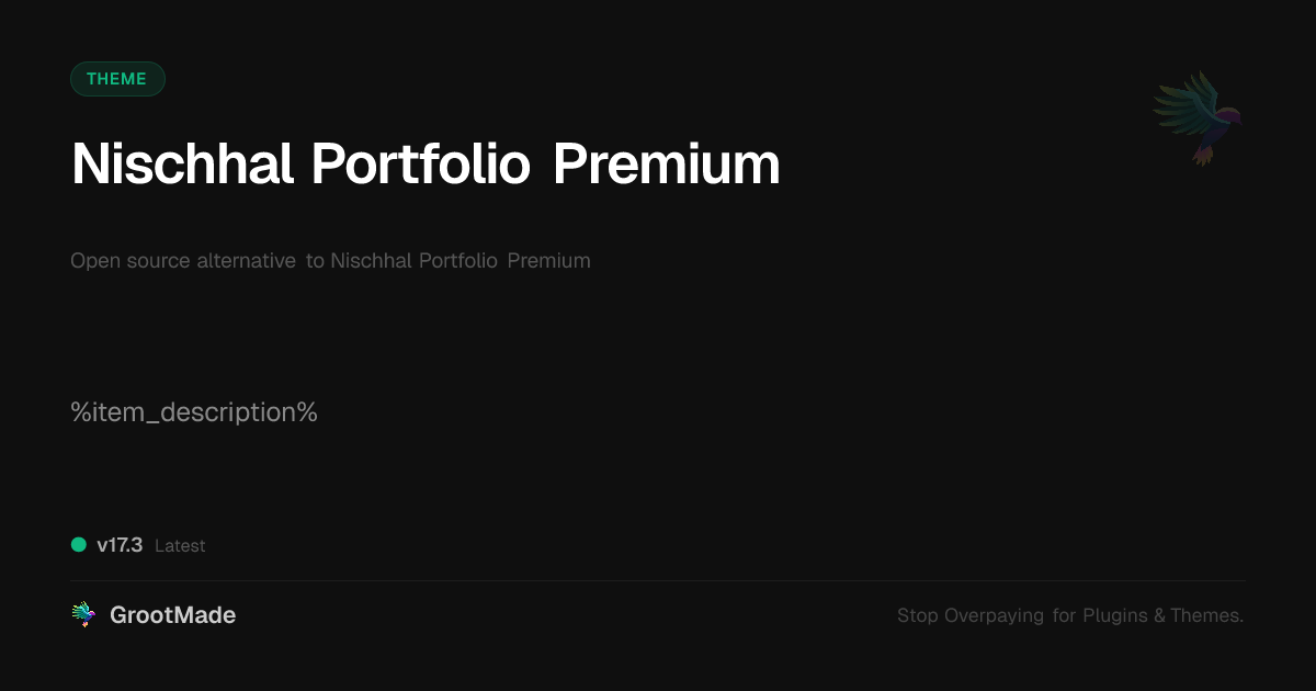 GrootMade is NOT affiliated with Nischhal Portfolio Premium or its original author. Nischhal Portfolio Premium™ is a trademark of its respective owner and use of it does not imply any endorsement or affiliation. This product has been forked under the GNU General Public License (GPL) and all non-GPL assets (such as proprietary images, fonts, and branding) have been removed. Distributing GPL-licensed code is 100% legal.