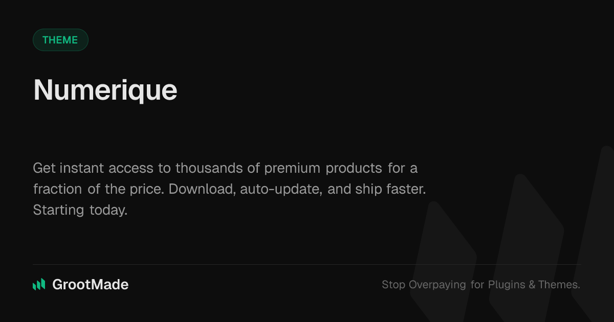 GrootMade is NOT affiliated with Numerique or its original author. Numerique™ is a trademark of its respective owner and use of it does not imply any endorsement or affiliation. This product has been forked under the GNU General Public License (GPL) and all non-GPL assets (such as proprietary images, fonts, and branding) have been removed. Distributing GPL-licensed code is 100% legal.