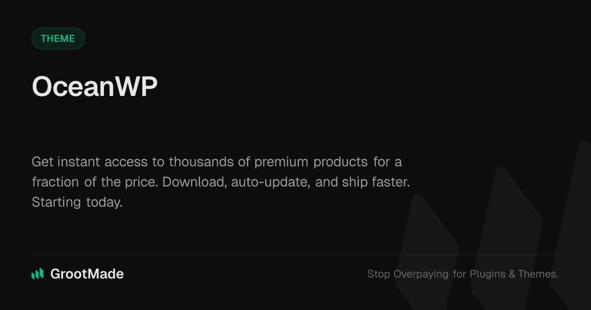 GrootMade is NOT affiliated with OceanWP or its original author. OceanWP™ is a trademark of its respective owner and use of it does not imply any endorsement or affiliation. This product has been forked under the GNU General Public License (GPL) and all non-GPL assets (such as proprietary images, fonts, and branding) have been removed. Distributing GPL-licensed code is 100% legal.