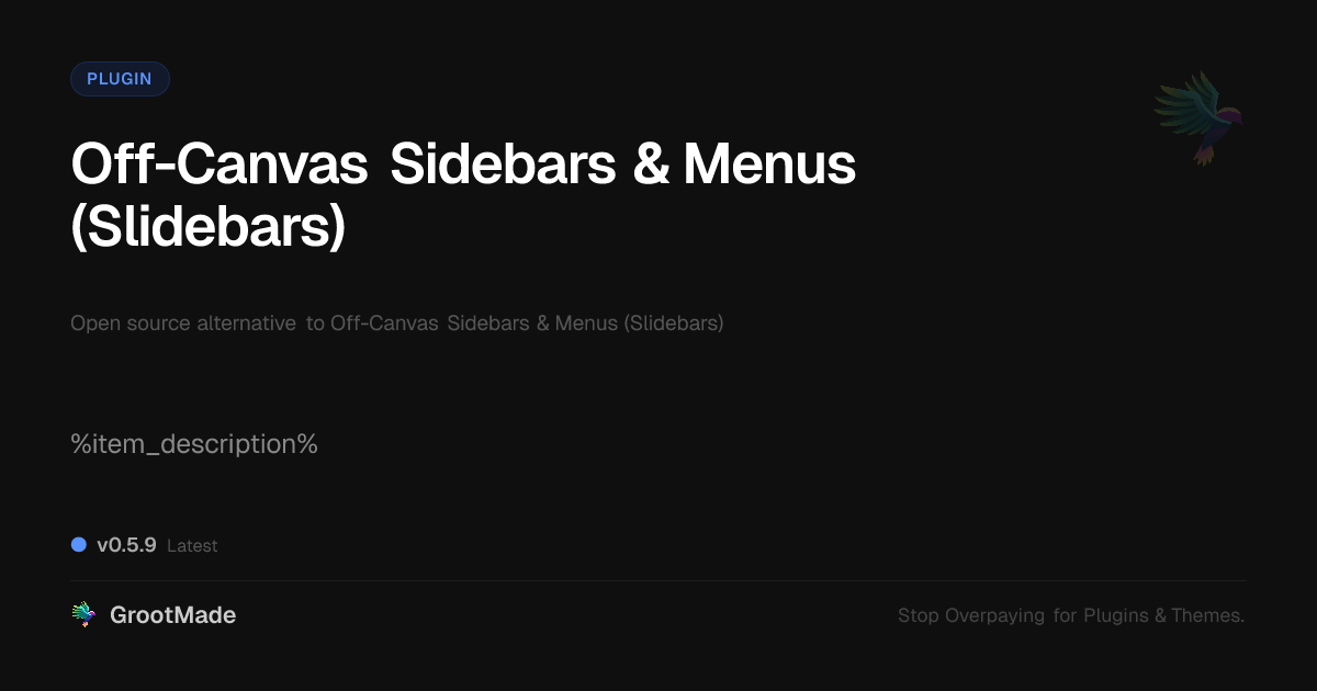 GrootMade is NOT affiliated with Off-Canvas Sidebars & Menus (Slidebars) or its original author. Off-Canvas Sidebars & Menus (Slidebars)™ is a trademark of its respective owner and use of it does not imply any endorsement or affiliation. This product has been forked under the GNU General Public License (GPL) and all non-GPL assets (such as proprietary images, fonts, and branding) have been removed. Distributing GPL-licensed code is 100% legal.