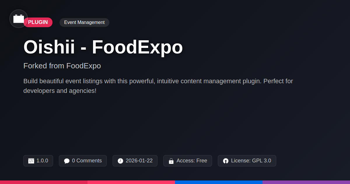 So, there you have it. Oishii - FoodExpo. It’s the event plugin that probably didn’t need to exist, but thank goodness it does. We’ve taken a solid foundation, polished it up, and made it something truly useful for anyone who’s ever wanted to showcase events without needing a wizard’s staff and a minor’s degree in database management. For you developers out there, you know the pain. You’ve navigated the labyrinthine settings of plugins that seem designed to test your patience. Agencies, you’ve faced clients who want the moon on a stick for the price of a cup of lukewarm coffee, and you need tools that are reliable, flexible, and won’t cause your hair to turn prematurely grey. And to all you open-source aficionados, you appreciate the beauty of community, transparency, and freedom. This fork embodies that spirit. It's about empowering you to build, to create, and to deliver stellar event experiences without unnecessary hurdles. It’s stable, it’s feature-rich, and frankly, it’s just easier to work with. So, stop dreading the event management aspect of your next project. Grab Oishii - FoodExpo, give it a spin, and discover how smooth building elegant event listings can actually be. Your sanity, and your clients, will thank you.