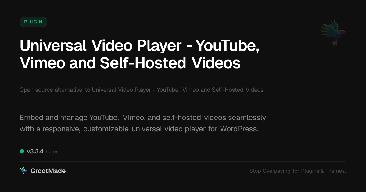 GrootMade is NOT affiliated with Universal Video Player - YouTube, Vimeo and Self-Hosted Videos or its original author. Universal Video Player - YouTube, Vimeo and Self-Hosted Videos™ is a trademark of its respective owner and use of it does not imply any endorsement or affiliation. This product has been forked under the GNU General Public License (GPL) and all non-GPL assets (such as proprietary images, fonts, and branding) have been removed. Distributing GPL-licensed code is 100% legal.