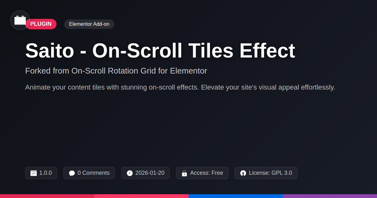 So, there you have it. If your website currently suffers from the digital equivalent of a yawn, and you're looking for a way to inject some serious personality without breaking the bank or your sanity, it’s time to consider the power of on-scroll animations. Saito - On-Scroll Tiles Effect isn't just another plugin; it's a carefully curated enhancement, a clever fork built on solid foundations, designed to make your content leap off the screen—literally. Forget static, boring layouts that lull your visitors into a stupor. This tool offers a compelling alternative, transforming passive scrolling into an engaging experience. Imagine your portfolio items gracefully pirouetting into view, your key features elegantly stacking up as the user descends the page, or your testimonials appearing with a subtle, eye-catching flourish. It’s about making your digital presence memorable, dynamic, and, dare we say, a little bit magical. For the developers and agencies out there, this means differentiating your services, offering clients a premium feel, and ultimately, building sites that don't just function but wow. And for the open-source enthusiasts, it embodies the spirit of smart, efficient development that borrows the best and refines it further. It’s about providing powerful, accessible tools that empower you to create truly distinctive online experiences. So, ditch the digital doldrums, embrace the delightful dynamism, and let your content do more than just appear—let it arrive with style.